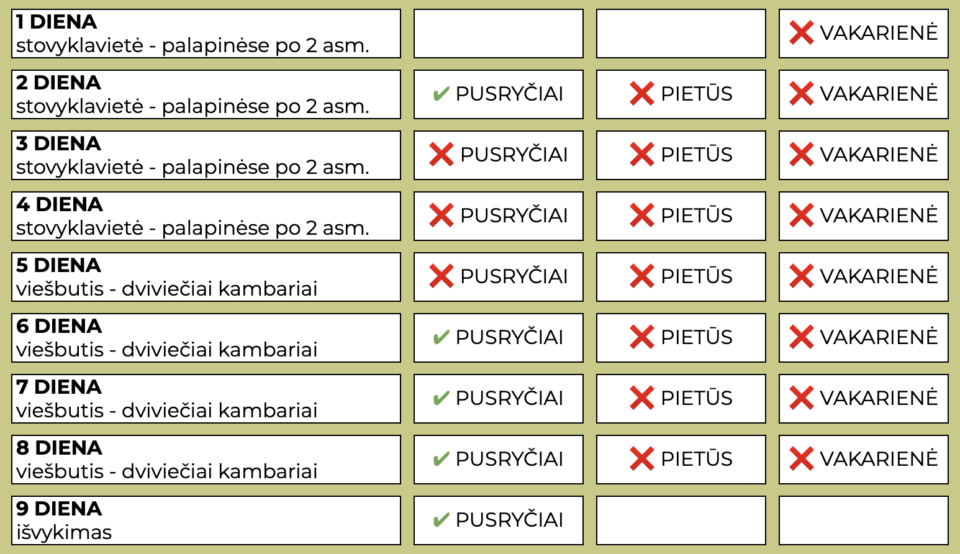 Įskaičiuota: tiesioginiai skrydžiai, bagažas, apgyvendinimas, maitinimas (pusryčiai ir vakarienės), žygeivių ir daiktų pervežimai, išskirtinė žygio programa, patyręs žygio vadas.